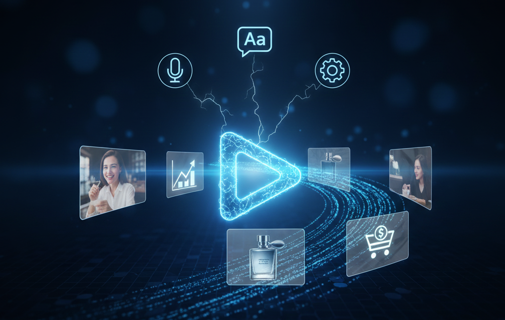 Key Feature: The engine processes specific requests, such as "A luxury watch advertisement with a cinematic feel," and automatically curates the script, footage, and voiceover.