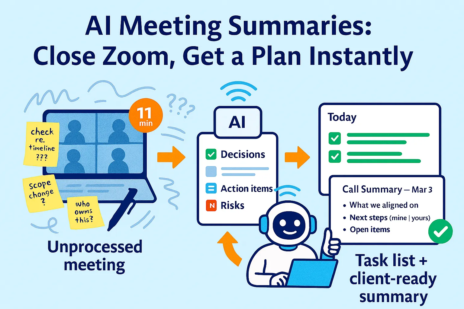 The AI meeting system solves this completely. You close Zoom. Within minutes, you have a structured summary with decisions, risks, and action items β automatically pushed to your task manager and ready to forward to the client. No reconstruction. No memory tax. No 4 hours of summarizing.