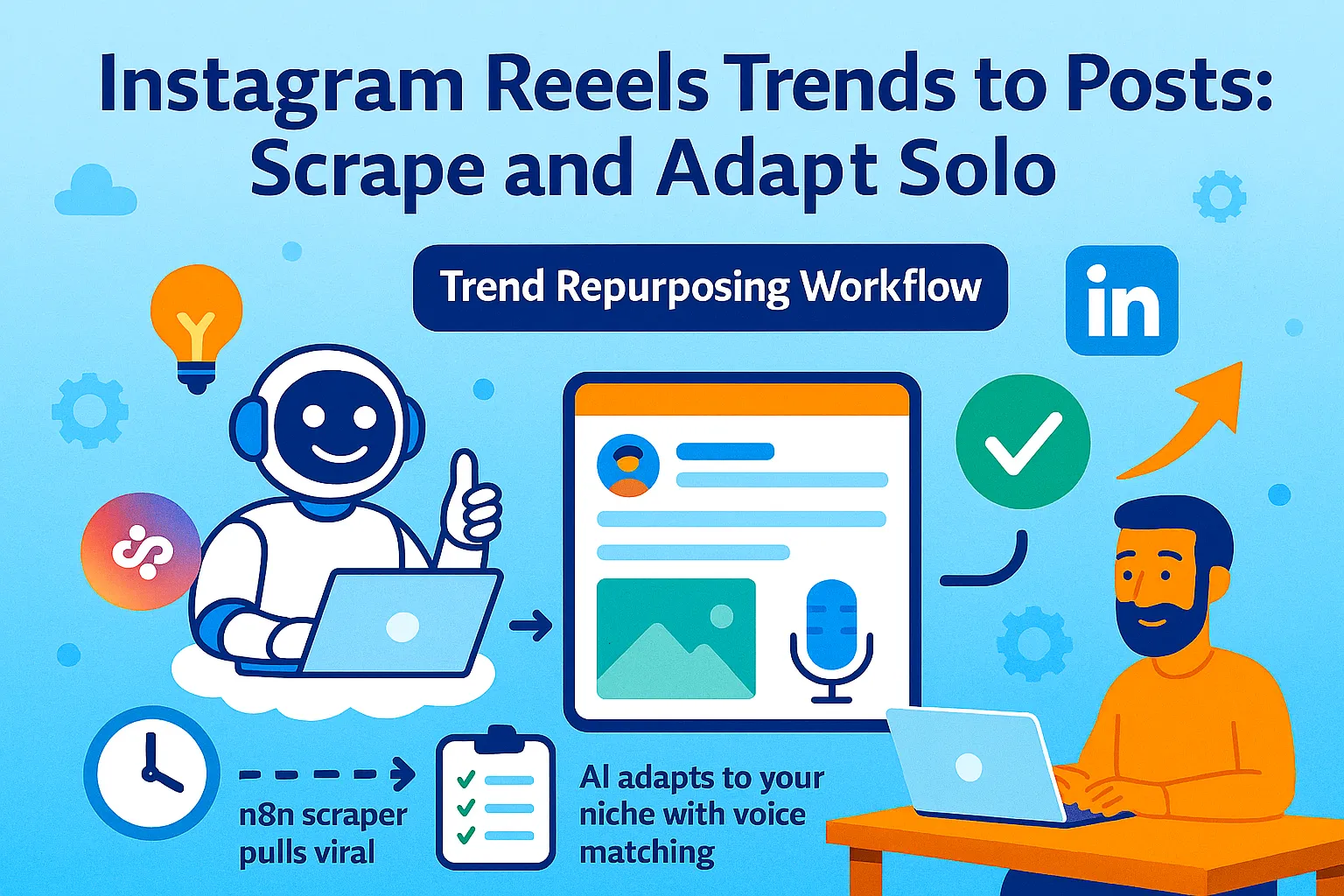 This guide shows you how to auto-scrape viral Reels weekly using n8n or Apify (no coding required), adapt them to your niche with AI voice matching, and post at peak algorithm times (7-11 PM weekdays) for maximum reach. All in 2 hours per week.